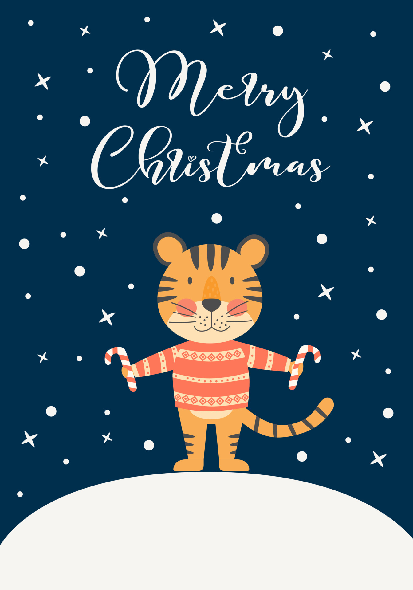 Modern Christmas Card 2021 (New Year’s Eve 2022 Cartoon tiger in a santa hat with a ball near the christmas tree Free ๐